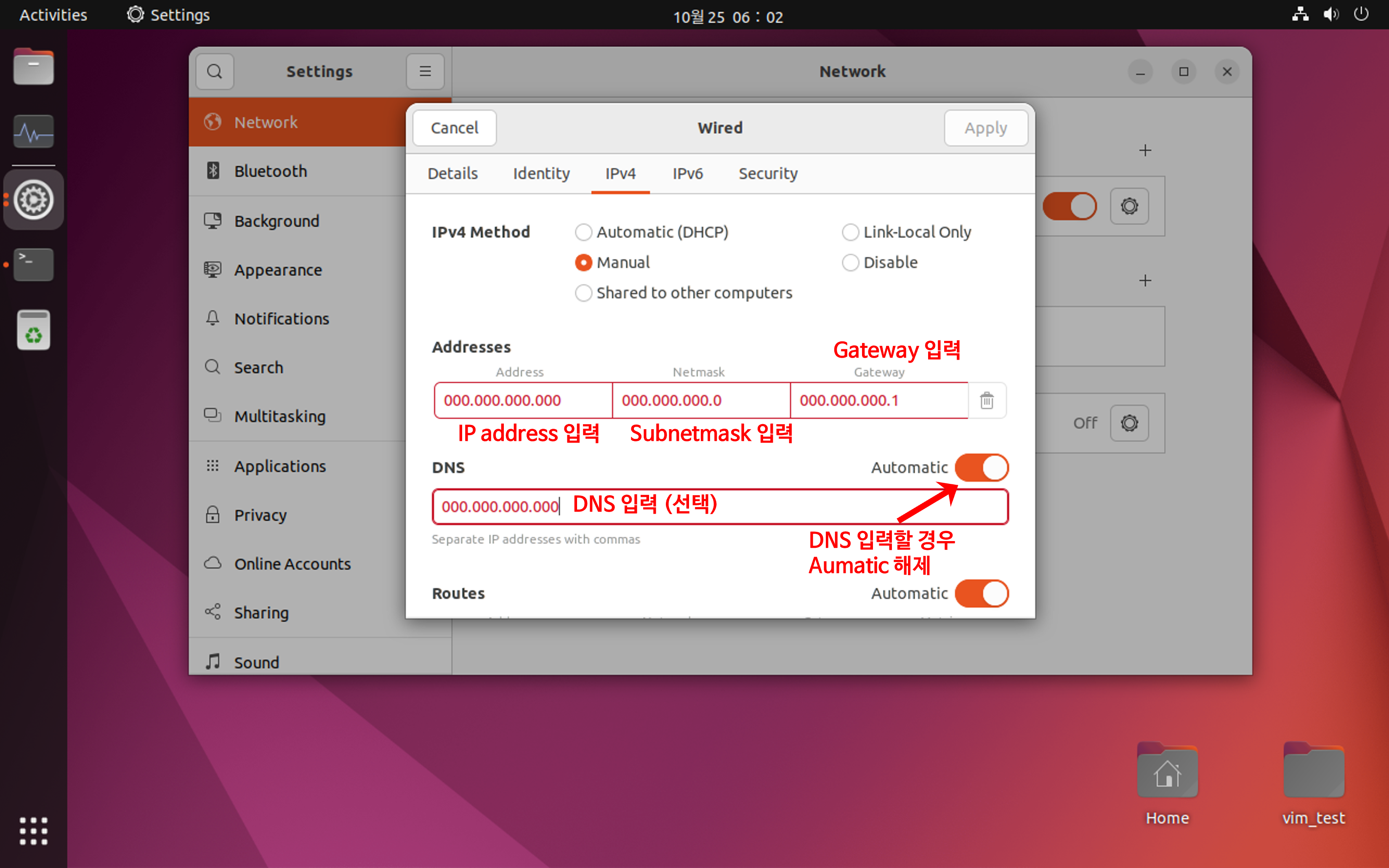 고정 IP 설정을 위해 IP 주소를 매뉴얼하게 입력해줘야 하기 때문에 manual 클릭