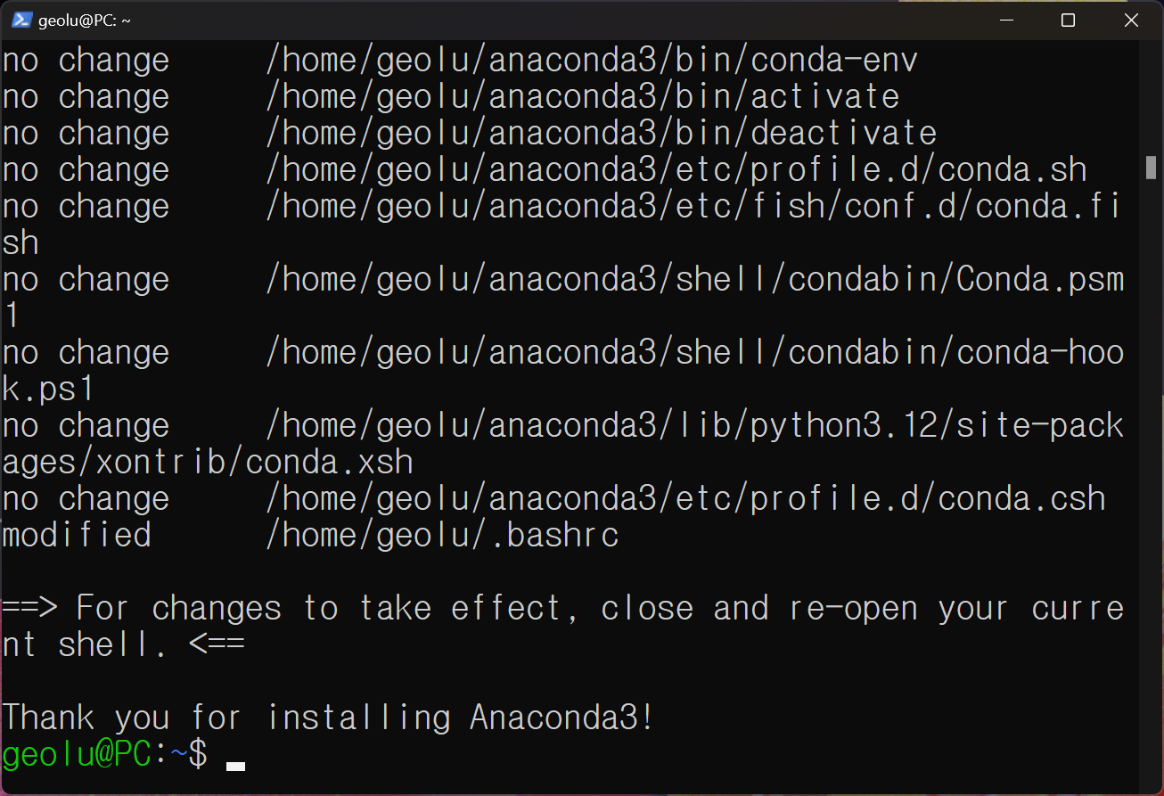 아래 명령어를 통해 새롭게 설치된 아나콘다 패키지를 터미널 프롬프트에 연동